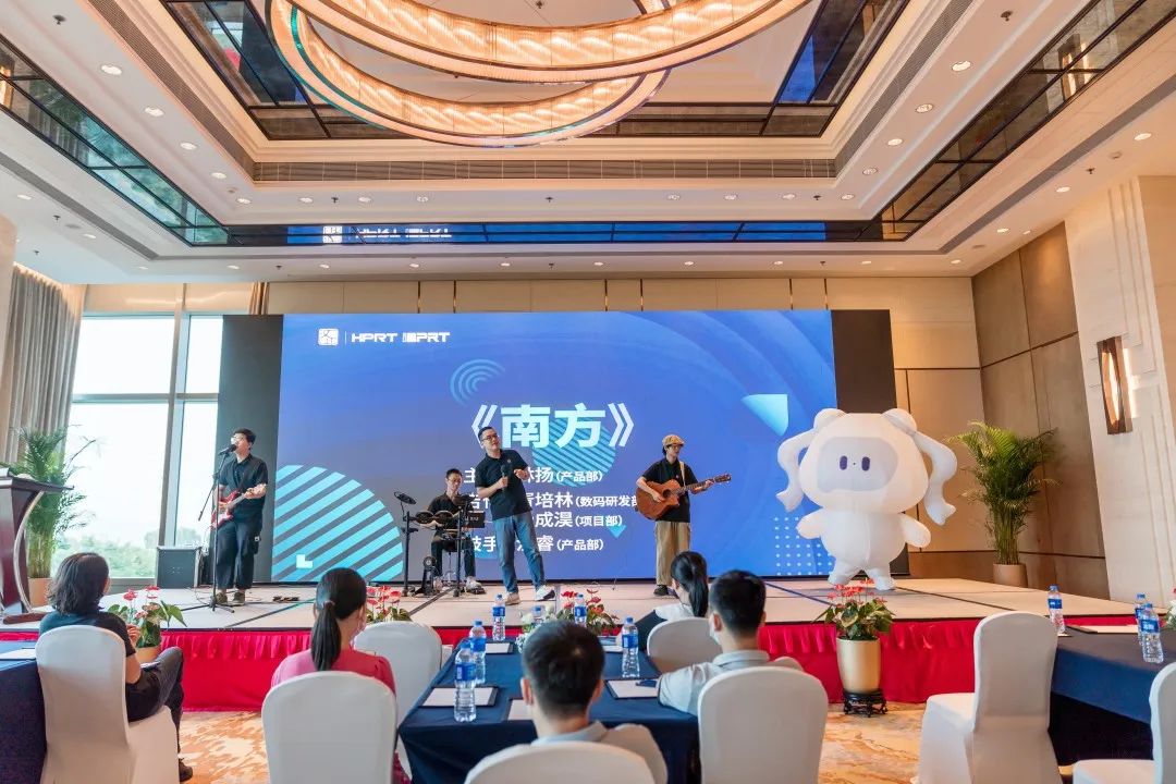 在中場休息階段,漢印工作人員為各位嘉賓貼心的準(zhǔn)備了茶點,在茶歇時間段,由產(chǎn)品總監(jiān)帶頭組成的漢印南十二路樂隊攜手漢印IP小昇昇為大家?guī)碛鋹倓勇牭母杪暫臀璧浮?/p>